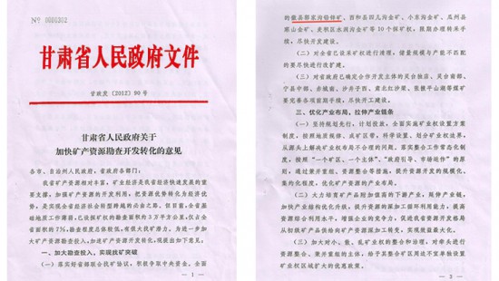 2012年7月,金徽矿业郭家沟铅锌矿被省政府〔2012〕90号文件列为首个限期探转采项目。