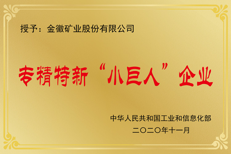 2021年2月,国家工信部授予金徽矿业股份有限公司专精特新“小巨人”企业荣誉称号。